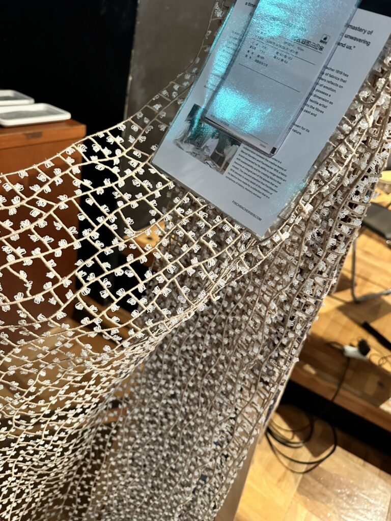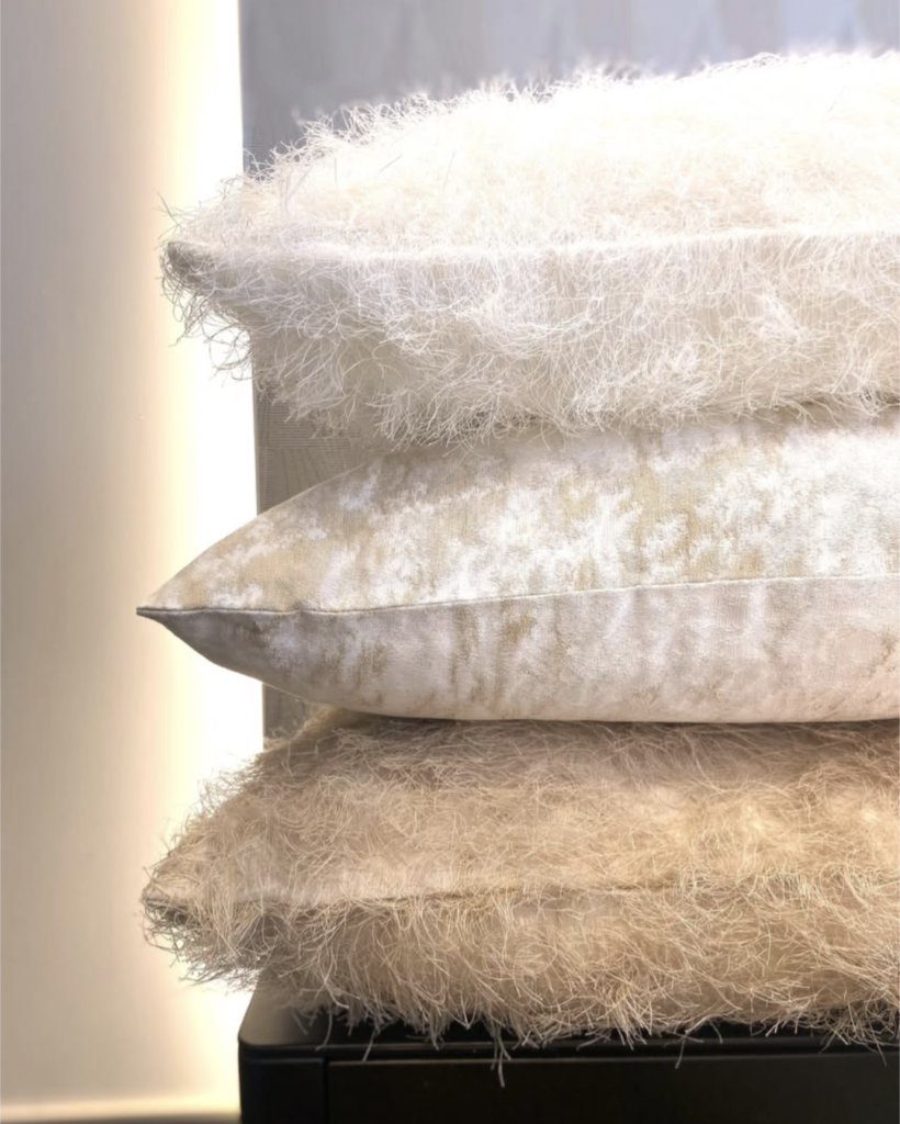 長いヘンプ糸は繊細なシルク糸に織り込まれクリップコード技法でカットされています。