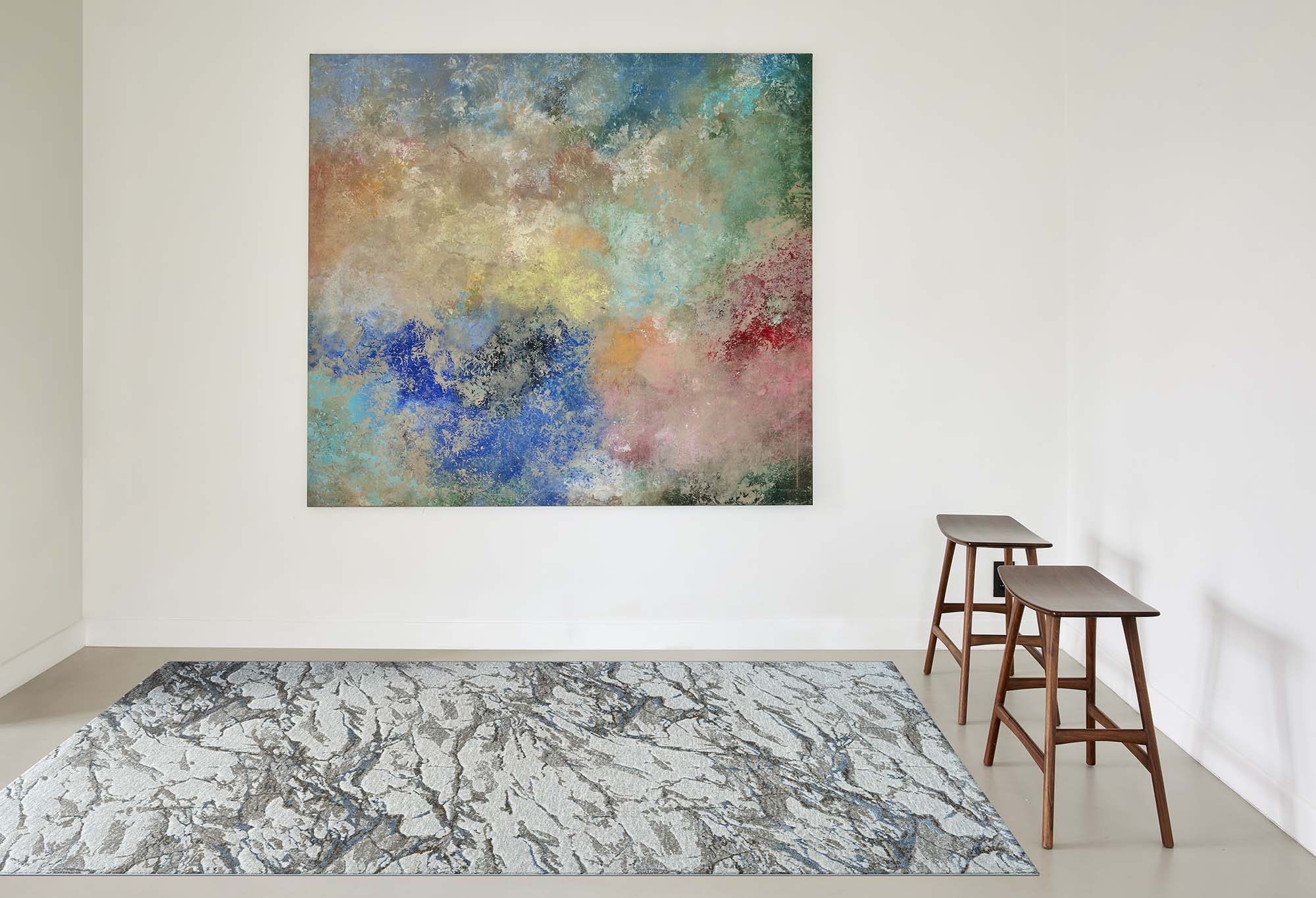 滲むような色彩と、淡く溶け合うトーンが織りなすデザインは、まるで靄(もや)や霧の中に浮かぶ景色のよう。グレーとベージュを基調とした絶妙なグラデーションが、インテリアに柔らかく溶け込みます。