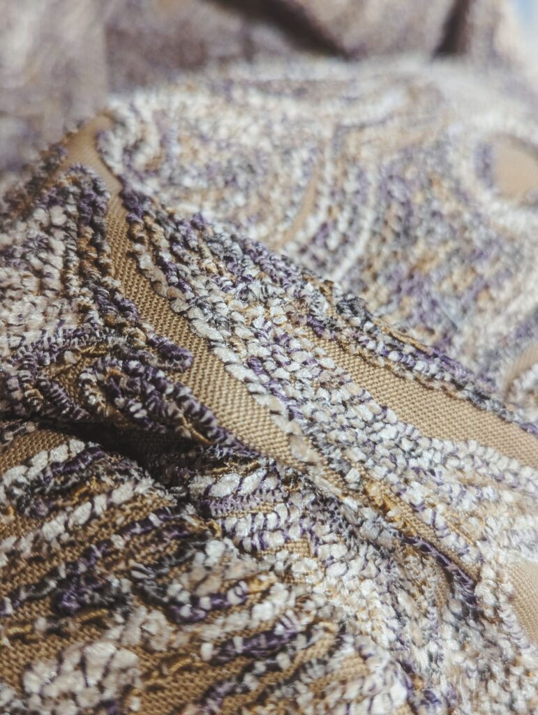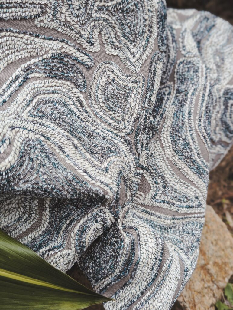 「BENU RUMBA RECYCLED(ビニュールンバ リサイクル)」は、ソウタシエ刺繍が全体に施されたドレープ生地です。ソウタシエ刺繍は、15世紀にフランスで生まれ、貴族の衣装や宝飾品に使用され、17世紀頃には上流階級のファッションにも使われるようになりました。