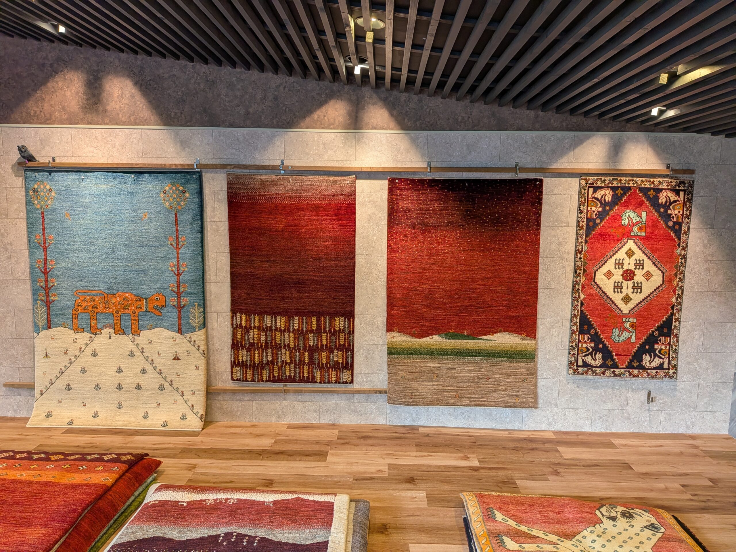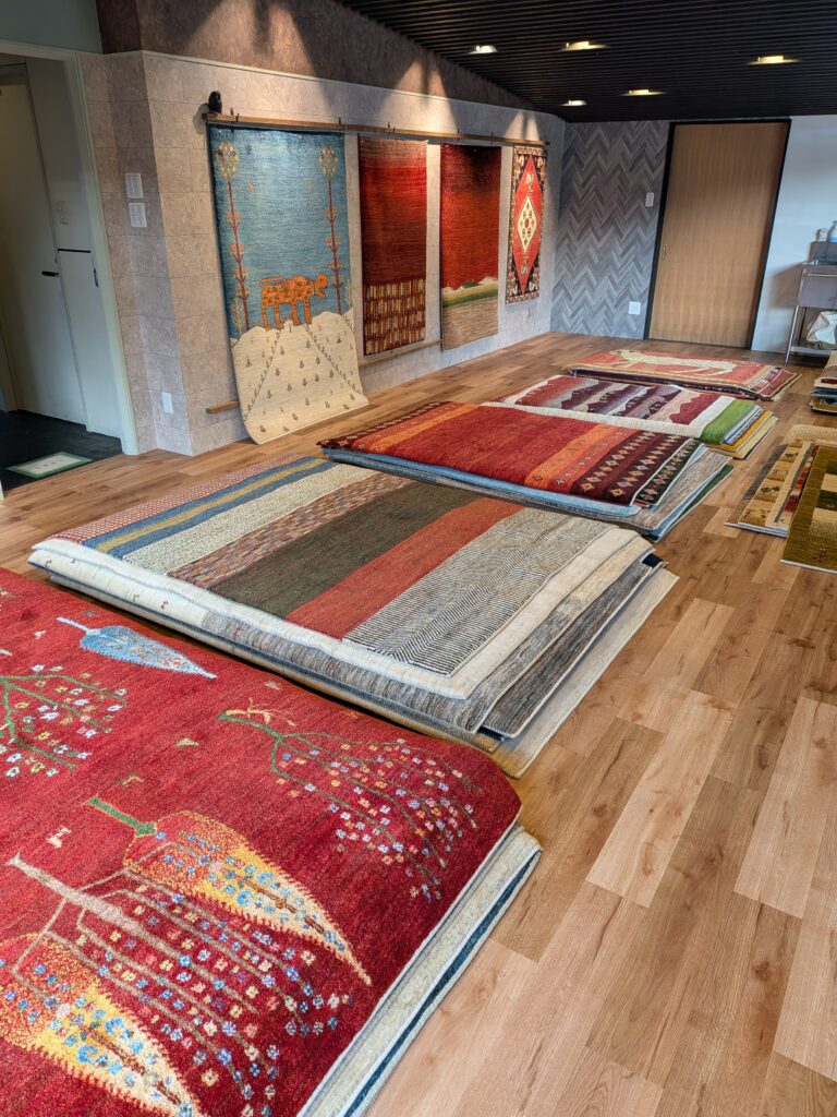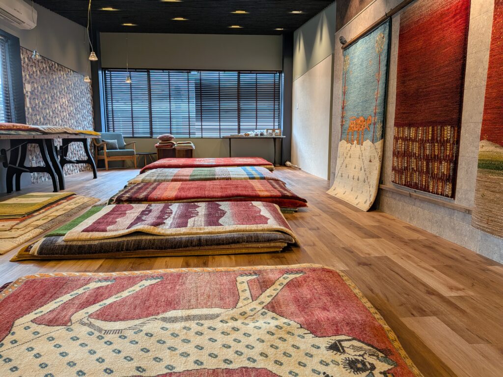 イランの織子さんの織る手織りの絨毯『ギャッベ』は展示会のみ多くの数をご覧いただけるようになっています。