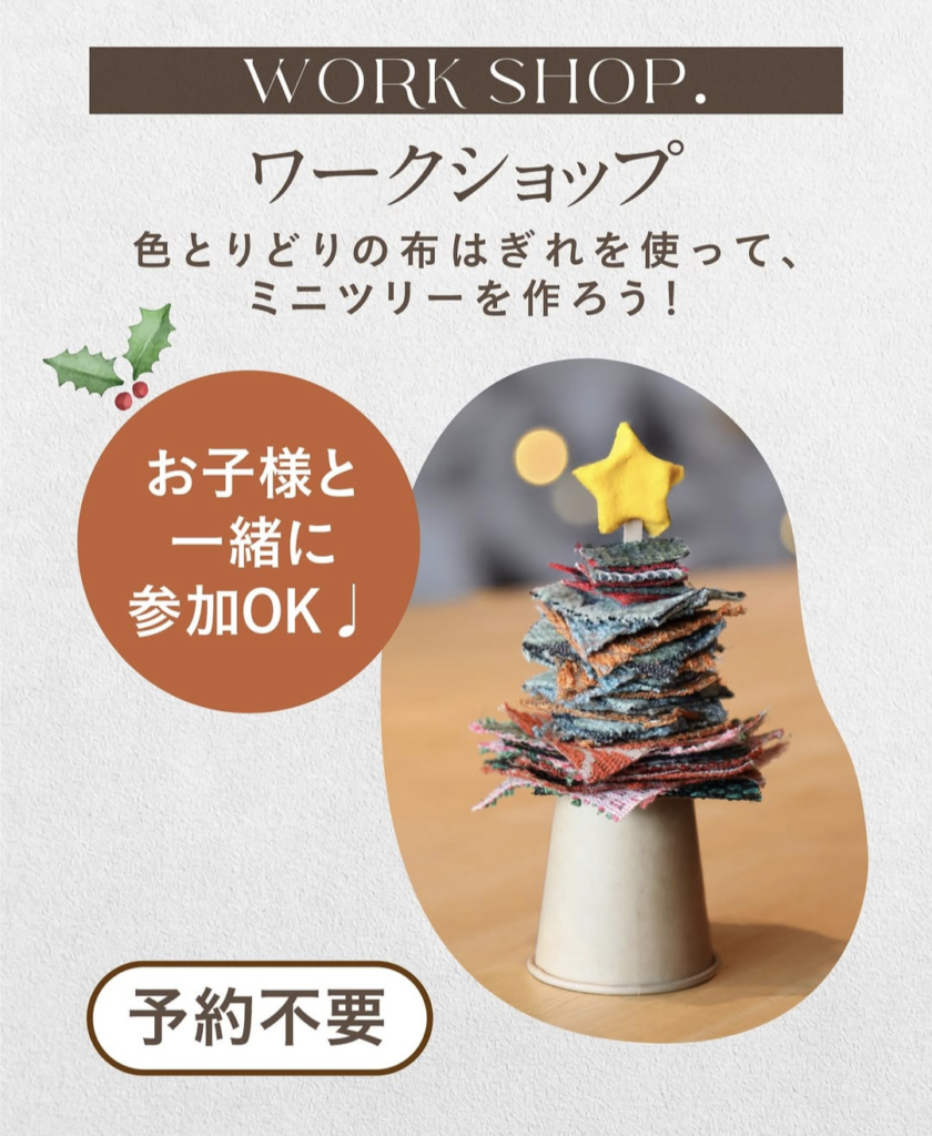 いろとりどりの生地を使ってミニツリーをつくろう!お子様もできるワークショップです。親子で楽しく作りませんか。