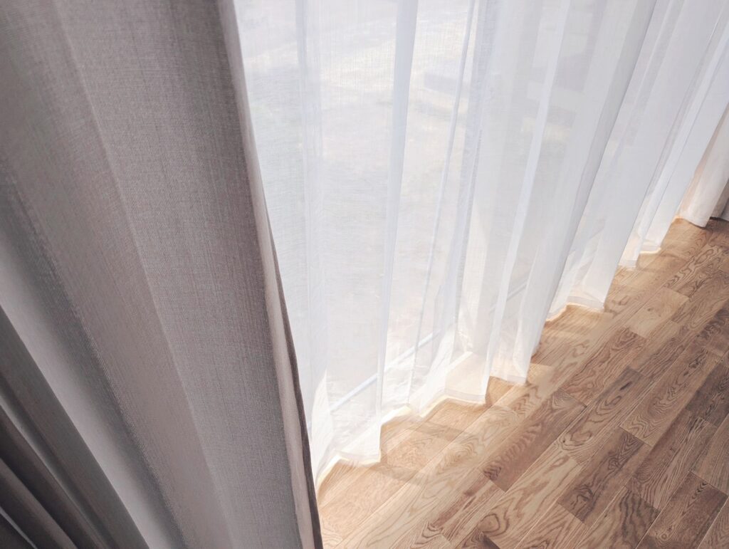 【掃出し窓と腰窓を1つの窓と見立てて,カーテンを引き分けるスタイル】