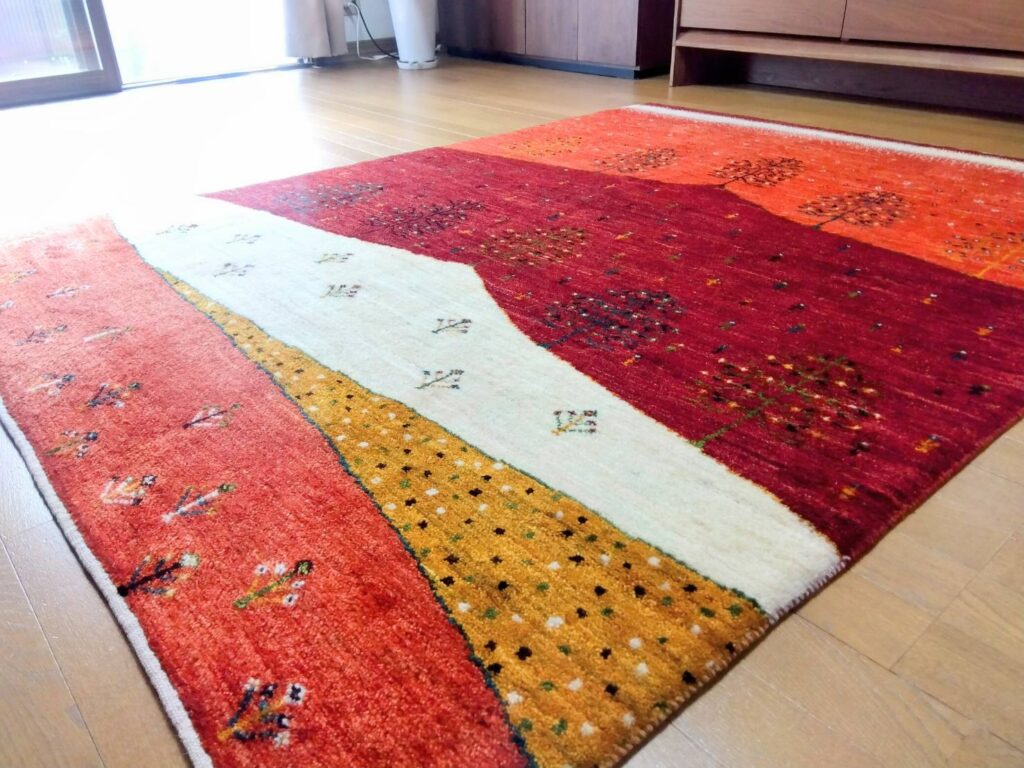 このギャッベを購入されたお客様は、長年ギャッベ購入を検討されており、様々な会場へ足を運びたくさんのギャッベを見てこられたそうです。インテリア紅葉が開催した過去のギャッベ展にも来場いただいておりました。今回来場され、「この1枚にしよう!」と、ご夫婦で選ばれました。
