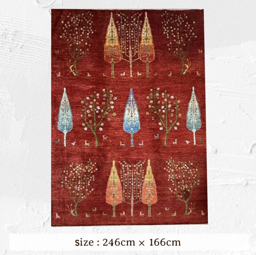 「生命の樹」のデザインを探されており、今回は赤色の風景の中に生命の樹が織られたギャッベを選ばれました。ご自宅のウォールナットの家具とも相性が良く、お部屋を明るくしてくれる1枚でした。