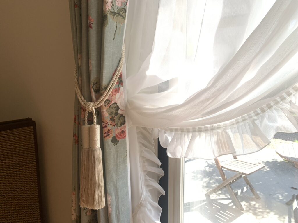 レースカーテンはフリル付きにし、ローラアシュレイのカタログに載っていそうな、英国な雰囲気の窓辺になりました。